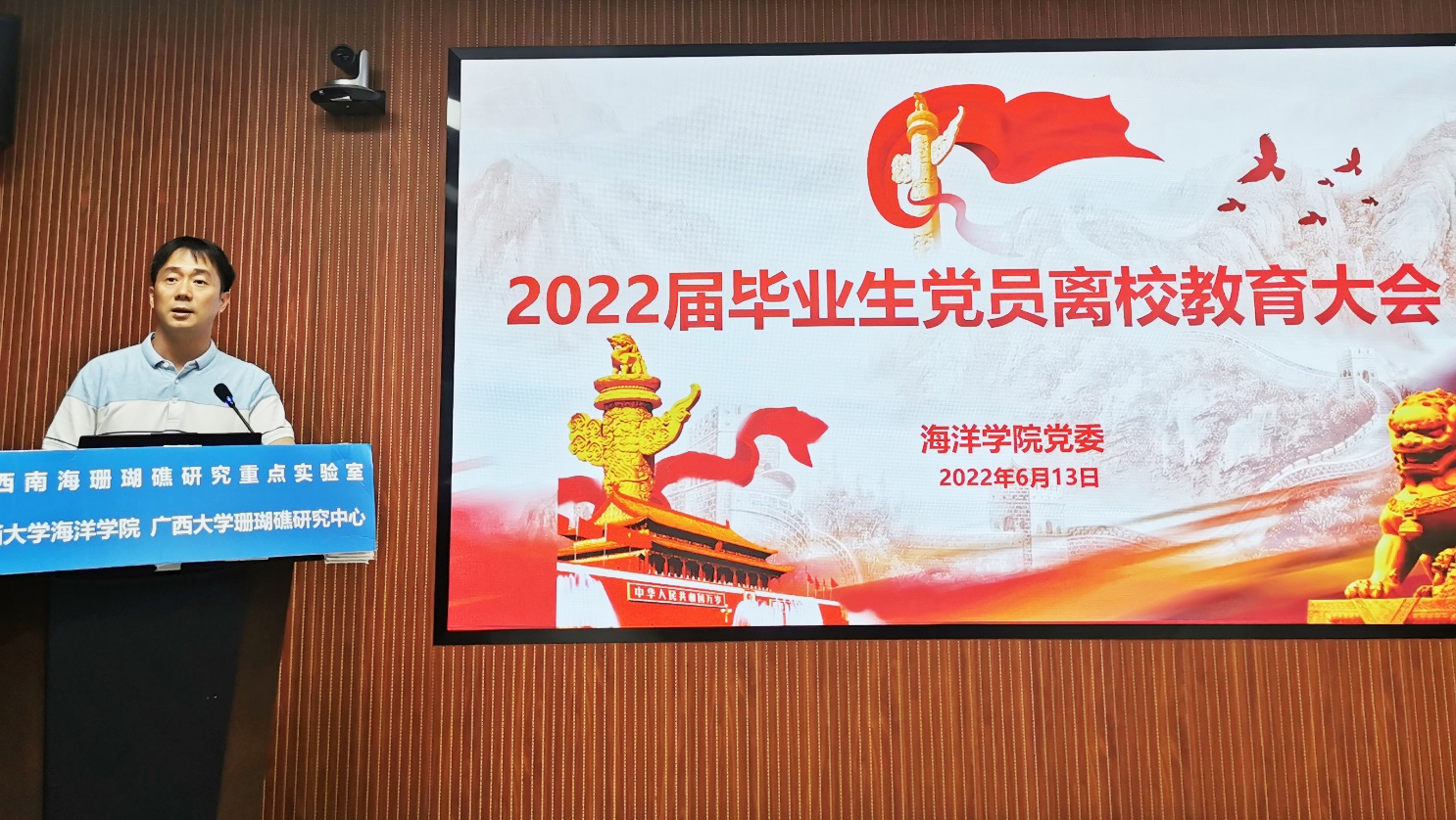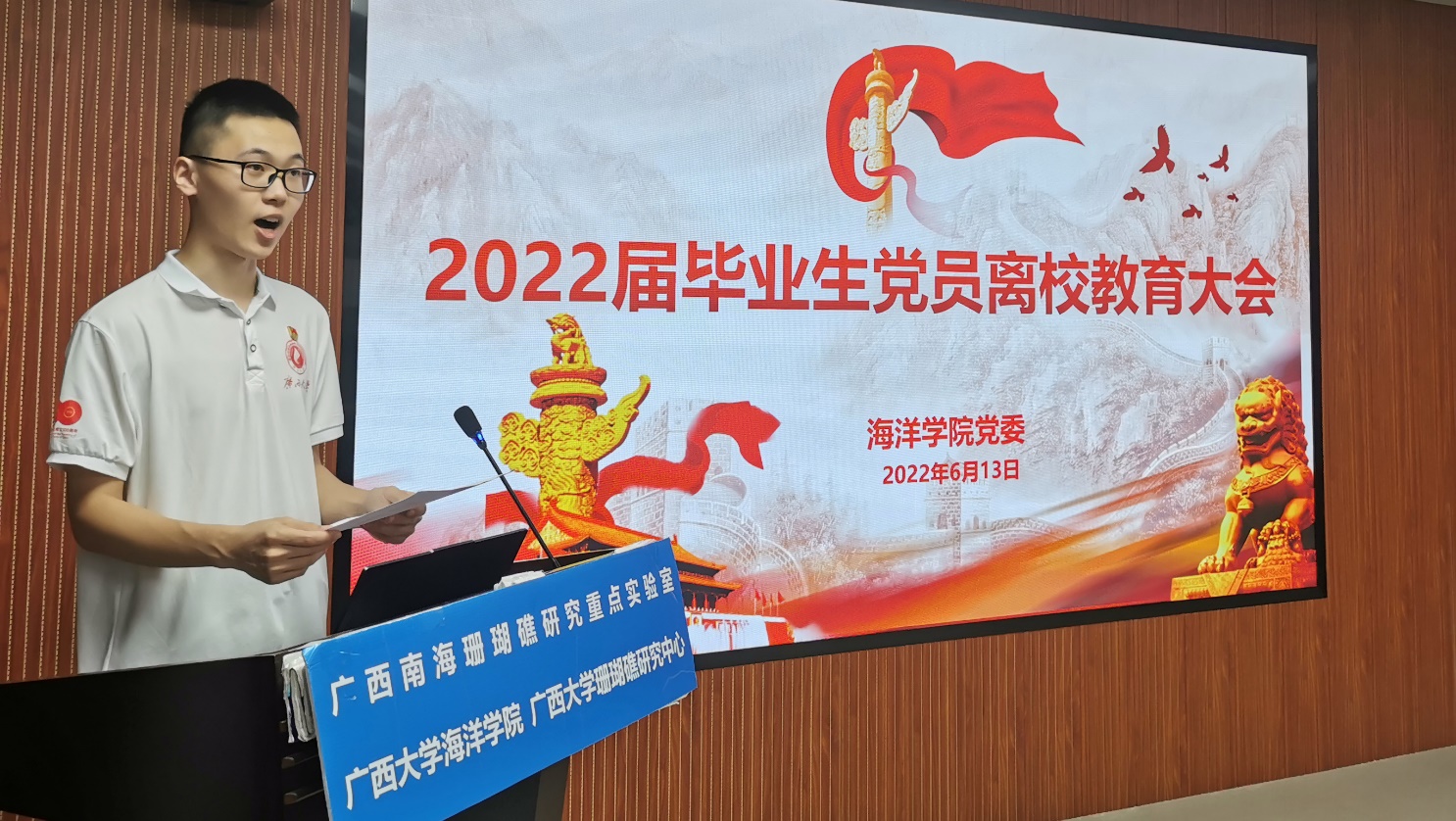 2018级海洋科学专业赵博义同志代表全体毕业生党员发言。他回顾了四年的老员工活,感谢公司、公司对全体党员的培养,号召广大毕业生党员坚定理想信念,坚守党员责任,坚持西大本色,胸怀祖国、脚踏实地、担当作为,做勇立潮头的奋斗者,在新的岗位上继续发挥先锋模范带头作用,用努力和成功来回报社会、回报母校。