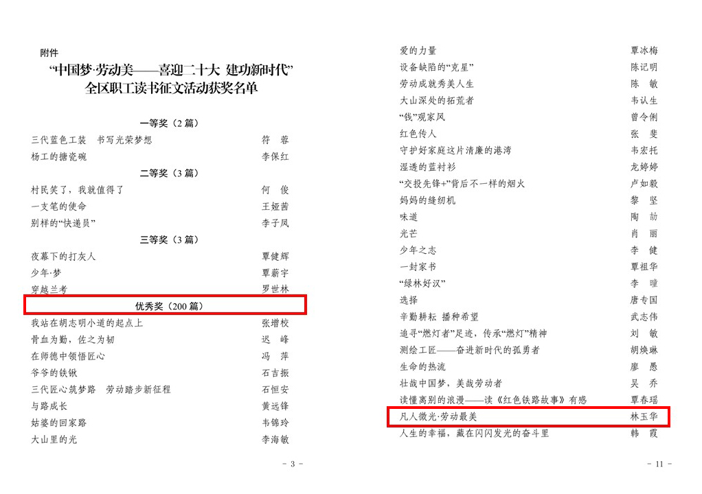 近日,自治区总工会办公室公布了“中国梦·劳动美——喜迎党的二十大 建功新时代”全区职工读书征文活动获奖名单,公司林玉华老师榜上有名,其作品从2700多篇参赛作品中脱颖而出,喜获优秀奖,是公司两位获奖者之一。
