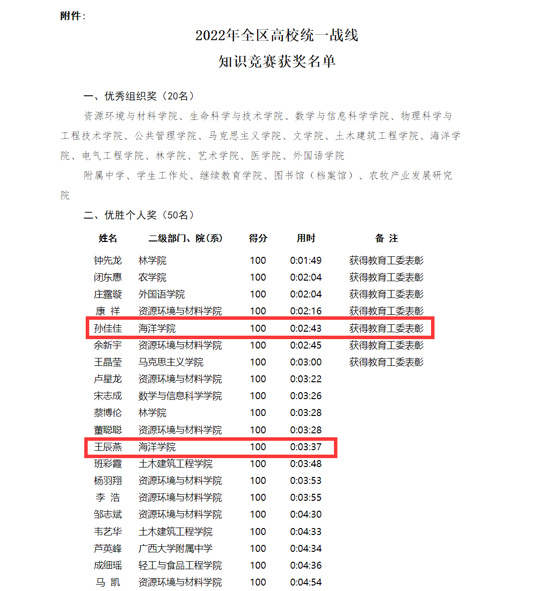 近日,自治区党委教育工委公布了“喜迎党的二十大 奋进新征程”2022年全区高校统一战线知识竞赛结果。公司在答题中组织成效显著、师生成绩优异,荣获优秀组织奖。公司孙佳佳同学、王辰燕同学在大赛中荣获“优胜个人奖”,其中孙佳佳同学为公司获得教育工委表彰的7人之一。