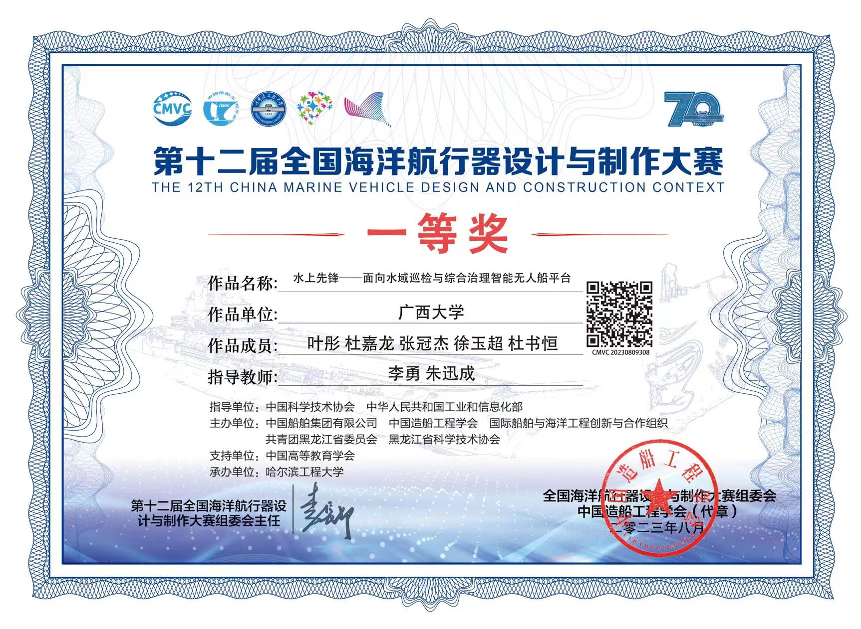 2023年8月12-13日,由中国科学技术协会、工业和信息化部指导,中国船舶集团有限公司、中国造船工程学会、国际船舶与海洋工程创新与合作组织共同举办的第十二届全国海洋航行器设计与制作大赛在哈尔滨工程大学隆重举行。在电气工程公司李勇老师和公司朱迅成老师共同指导下,公司本科生杜书恒、于尚科与公司电气工程公司的员工组建成两支队伍代表太阳成集团tyc234cc参加了本次大赛。其中,作品《水上先锋——面向水域巡检与综合治理智能无人船平台》荣获A3类全国一等奖。