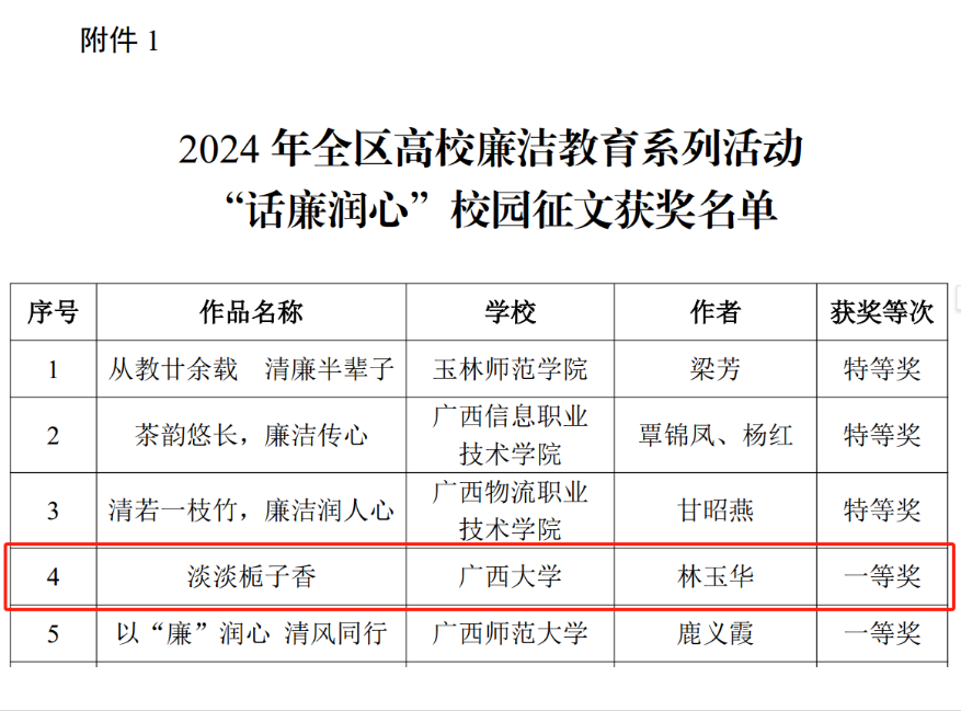 近日,自治区党委教育工委公布了2024年全区高校廉洁教育系列活动评选结果,公司林玉华老师的作品《淡淡栀子香》荣获2024 年全区高校廉洁教育系列活动“话廉润心”校园征文一等奖。