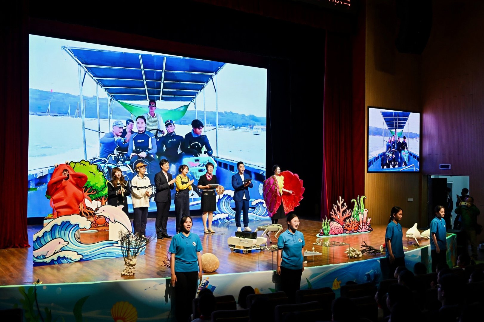 本次活动课程以海洋科普舞台剧为载体,课程中融入公司AI护海成果,突出本土生态特色与科技赋能亮点,引导青少年从认知北部湾、理解AI护海到践行护海行动,厚植海洋强国理念,彰显广西青年担当。现场同步设置了海洋古生物标本展、机器人互动、海洋科考实物展示区、潜水科普及海洋“留声”心愿墙,员工近距离触摸体验,直观感受科技赋能海洋保护的独特魅力。