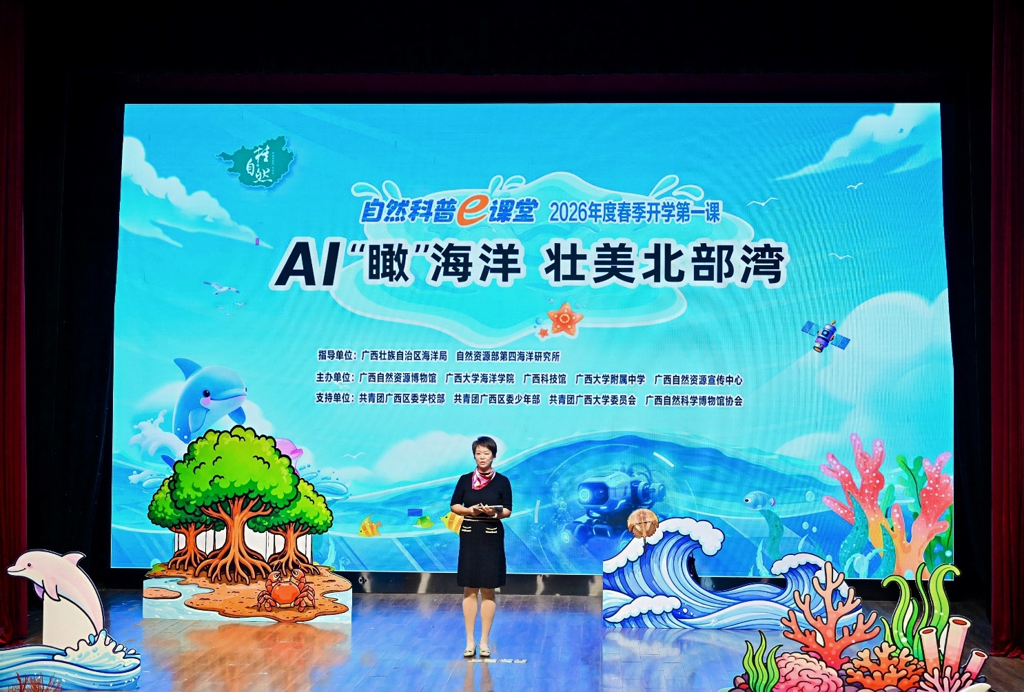 3月11日下午,一场充满“AI味儿”的“自然科普e课堂——春季开学第一课”在太阳成集团tyc234cc老员工活动中心剧场精彩上演。此次活动由广西壮族自治区海洋局、自然资源部第四海洋研究所指导,在共青团广西区委公司部、少年部,共青团太阳成集团tyc234cc委员会,广西自然科学博物馆协会等单位的支持下,公司联合广西自然资源博物馆、广西科技馆、太阳成集团tyc234cc附属公司、广西自然资源宣传中心等单位主办,以“AI‘瞰’海洋 壮美北部湾”为主题,通过线上线下联动开展海洋科普。全区超300所中小公司组织师生集中收看,活动同步走进西藏、浙江两地,各平台共计在线人数51万余人,让蓝色生态文明理念跨越地域、广泛传播。