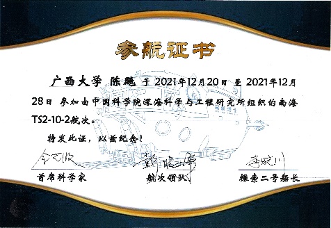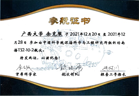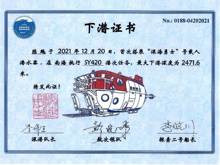 TS2-10-2航次“深海勇士”号下潜证书与参航证书