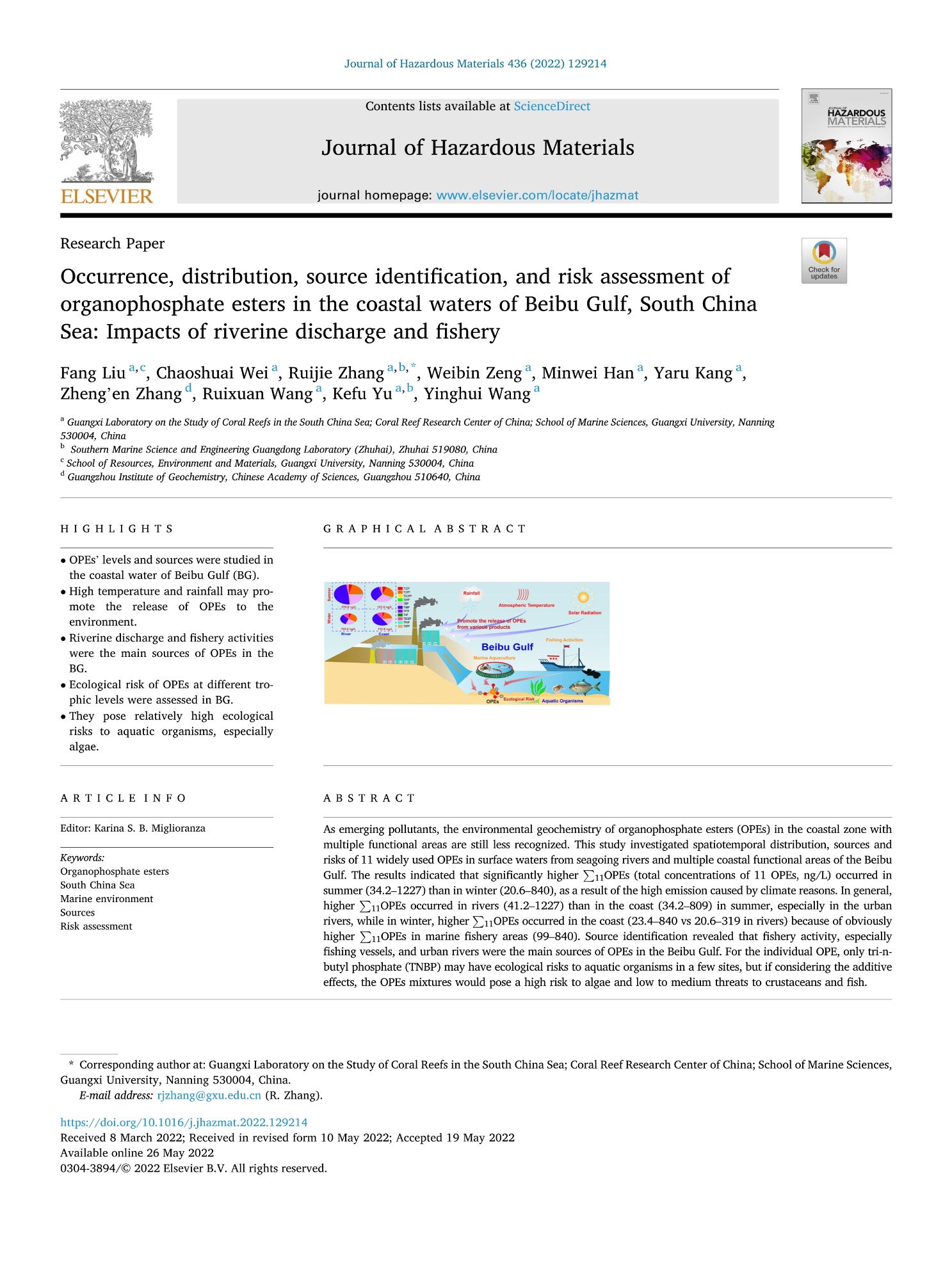 近日,公司2020级硕士研究生刘方在张瑞杰副教授指导下,以第一作者在国际环境领域权威期刊Journal of Hazardous Materials (IF=10.588)发表论文“Occurrence, distribution, source identification, and risk assessment of organophosphate esters in the coastal waters of Beibu Gulf, South China Sea: impacts of riverine discharge and fishery”。