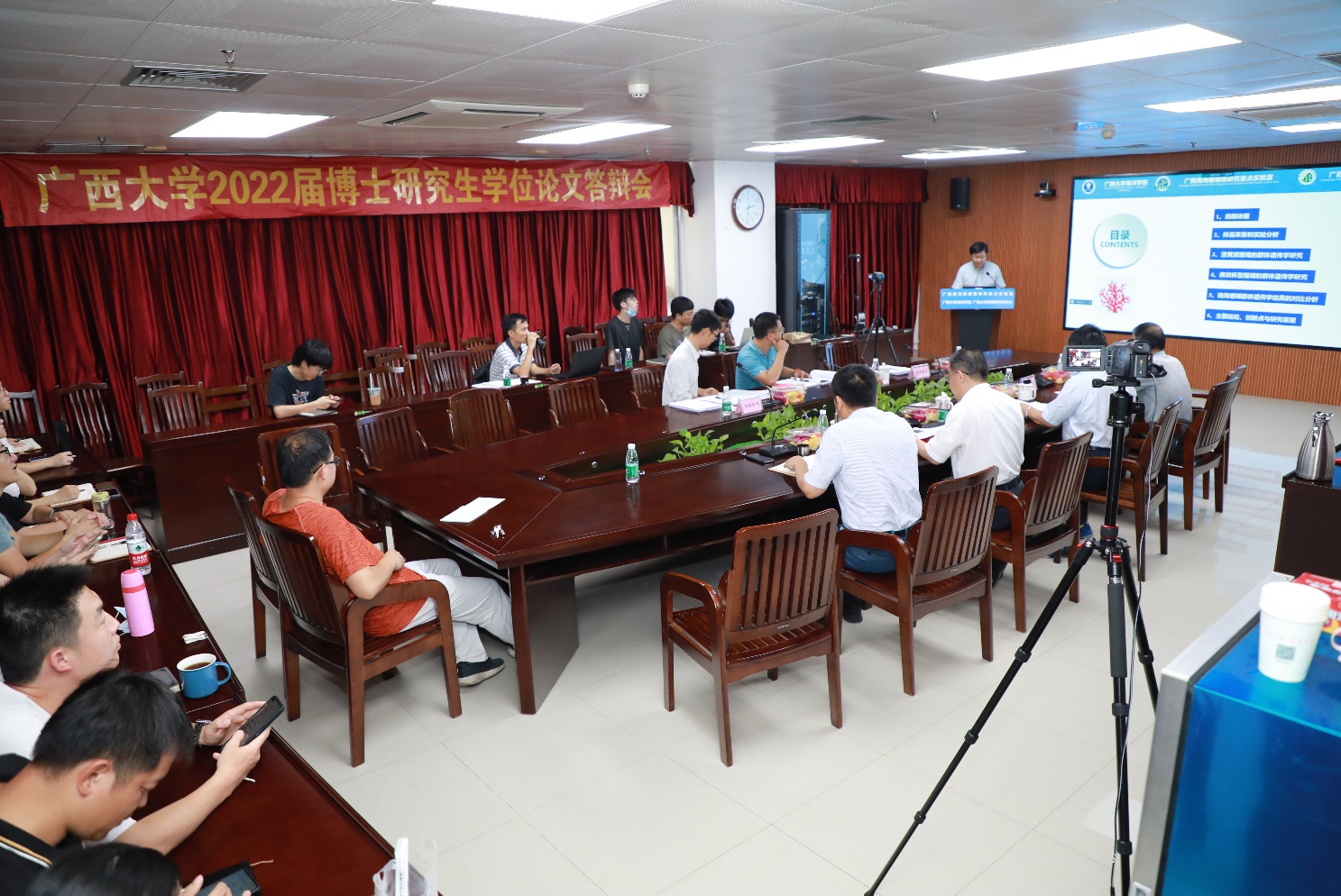 博士研究生李明的学位论文题目是《南海广布种澄黄滨珊瑚和低纬度优势种疣状杯形珊瑚的群体遗传学研究》,许铭本的学位论文题目是《北部湾球形棕囊藻游离单细胞与囊体阶段的关键影响因子研究》。李明和许铭本分别就学位论文的选题依据、科学问题、研究对象及方法、研究结果和结论、论文创新点与研究展望等方面进行汇报,展示了自己在攻读博士学位期间的研究工作与成绩。