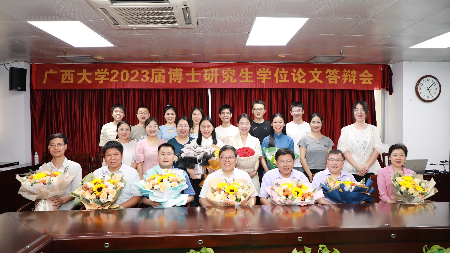 参加答辩的博士研究生与答辩主席、答辩委员、部分在读研究生们合影留念