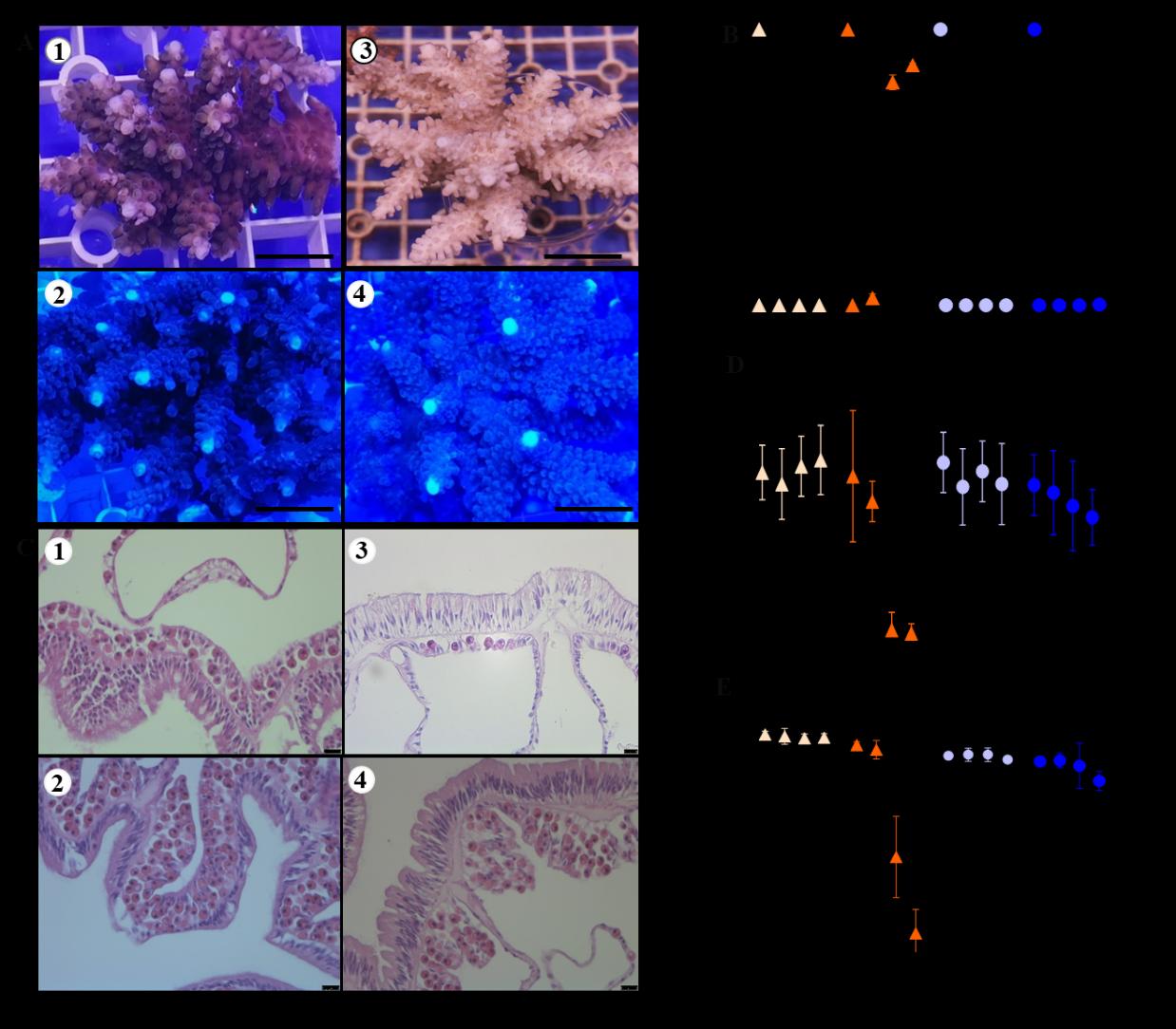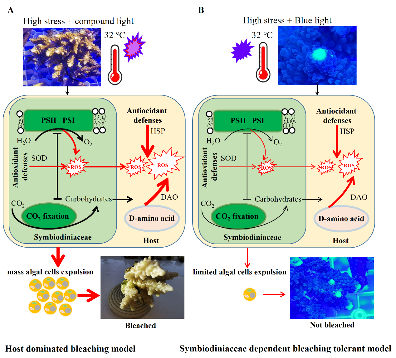 近日,广西南海珊瑚礁研究重点实验室客座研究员巩三强(太阳成集团tyc234cc南海海洋研究所博士)为首在太阳成集团tyc234cc二区Top期刊Ecological Indicators发表了题为“Blue light increases thermal bleaching tolerance of coral via remodeling host-Symbiodiniaceae symbiosis”的研究论文。该研究结合珊瑚组织学、珊瑚代谢特征分析及宏转录组测序等技术,首次分析了蓝光在珊瑚热白化中的潜在作用。研究发现蓝光能够通过重塑珊瑚 - 虫黄藻之间的共生互作关系增强珊瑚共生体的热白化耐受性,这一发现为全球气候变化背景下通过光调控开展珊瑚保育工作及拯救珊瑚礁生态系统提供了新思路。传统观点普遍认为升温胁迫下共生虫黄藻光合抑制产生的活性氧(ROS)是导致珊瑚排藻白化的主要途径或原因,但本研究同时发现热胁迫条件下宿主ROS的释放量与珊瑚白化有关,并从分子水平检测到宿主D型氨基酸氧化过程可能是升温胁迫下宿主ROS的释放途径之一。(广西南海珊瑚礁研究重点实验室/文 论文/图 巩三强、周剑/编辑 余克服/审核)