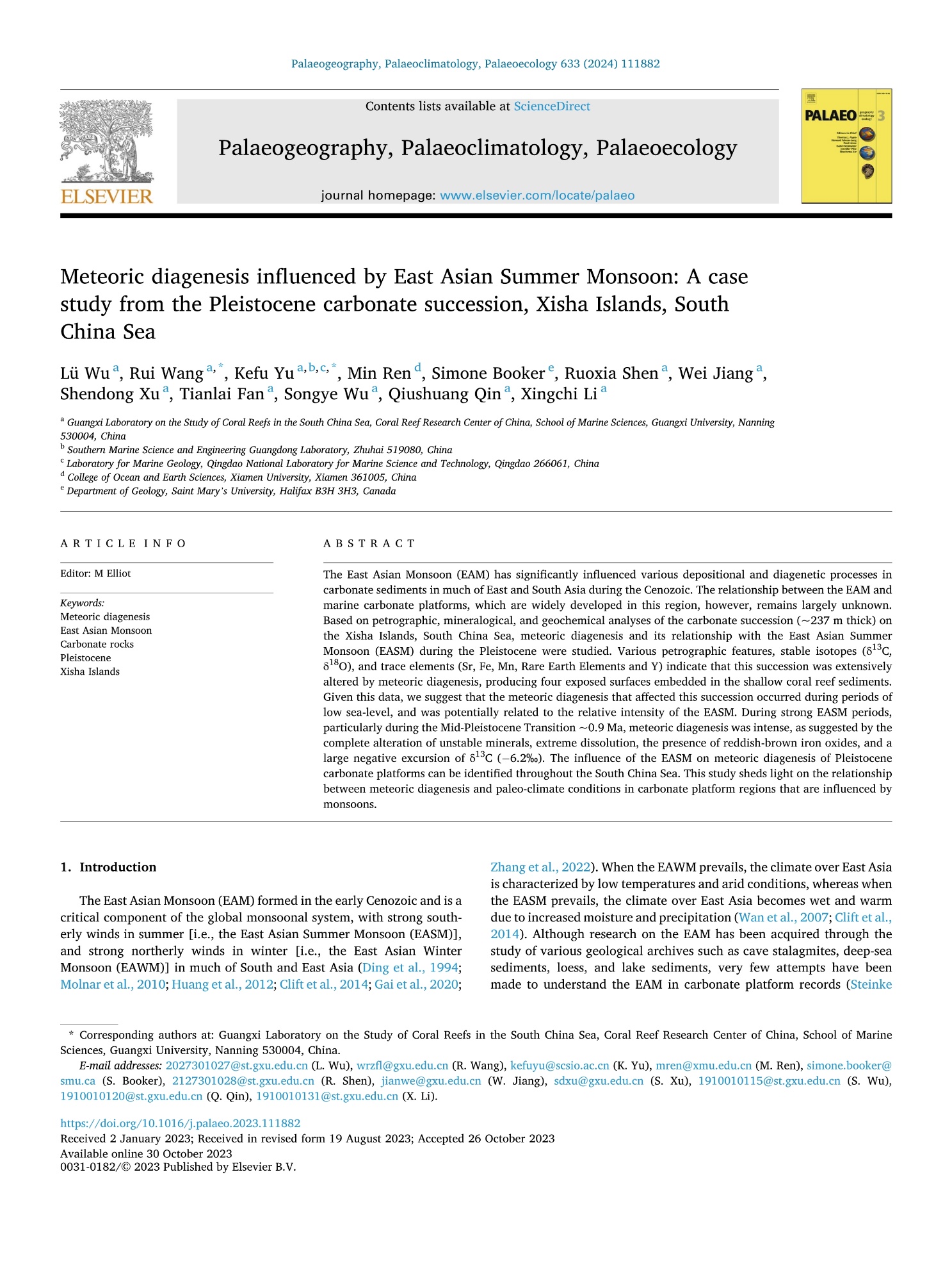 近日,在公司王瑞副教授等的指导下,硕士研究生吴律以第1作者身份在经典SCI期刊Palaeogeography Palaeoclimatology Palaeoecology(二区Top)上发表论文“Meteoric diagenesis inffuenced by East Asian Summer Monsoon: A case study from the Pleistocene carbonate succession, Xisha Islands, South China Sea”。该论文揭示了更新世时期西沙地区珊瑚礁灰岩的大气淡水成岩作用受到了东亚季风的影响,为了解碳酸盐岩台地发育演化与古气候之间的关系提供了新的视角。