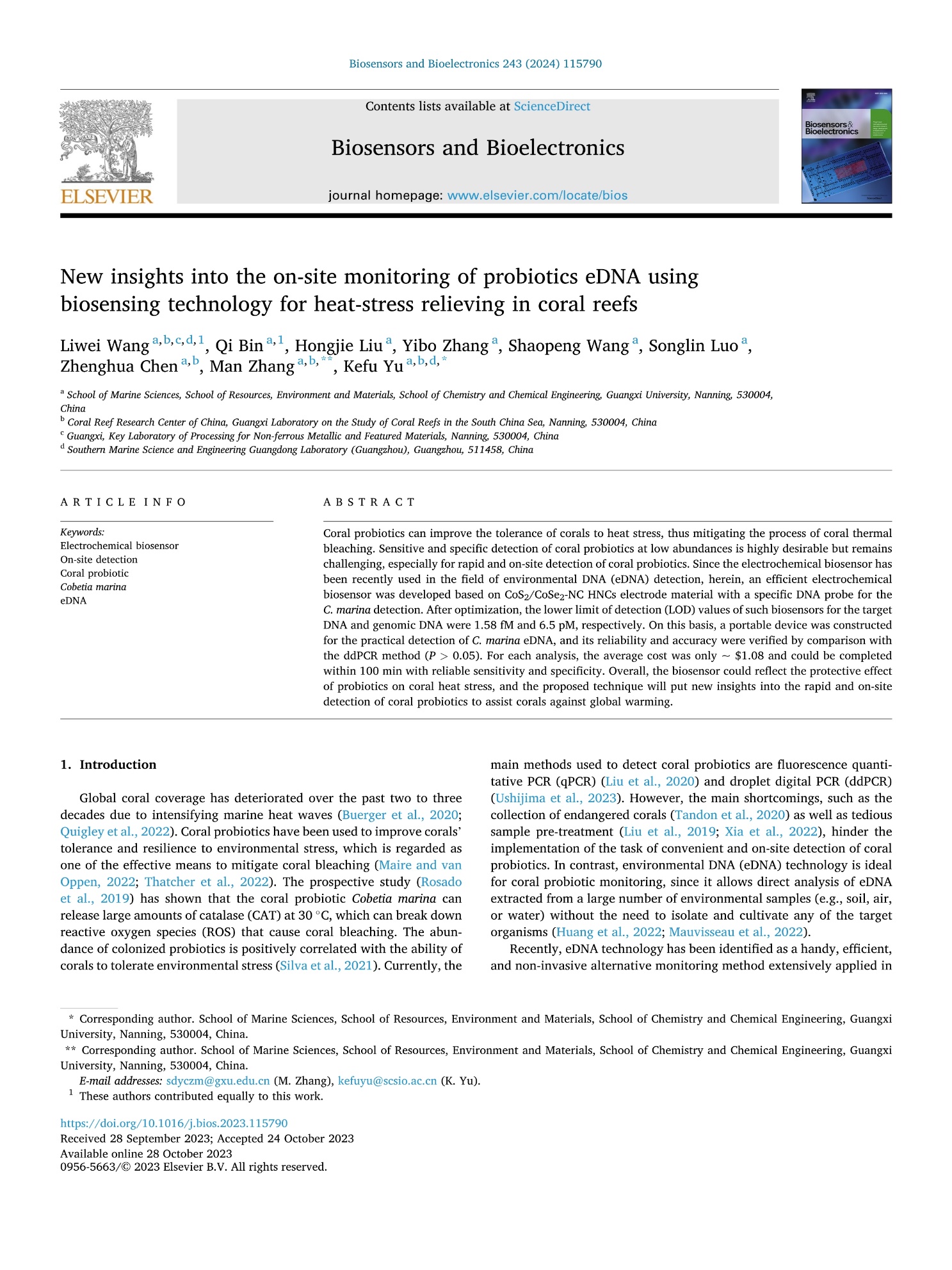 近日,公司副教授王丽伟及其指导的硕士研究生宾琪等在太阳成集团tyc234cc一区Top期刊Biosensors and Bioelectronics发表了题为“New insights into the on-site monitoring of probiotics eDNA using biosensing technology for heat-stress relieving in coral reefs”的研究论文。