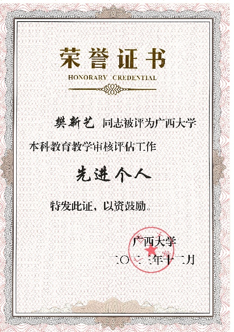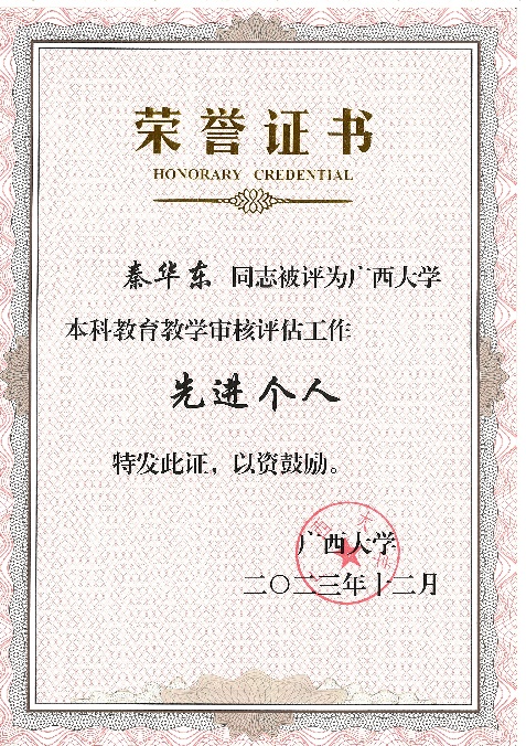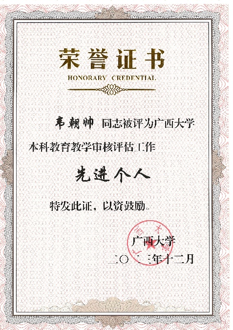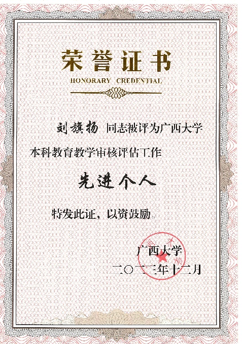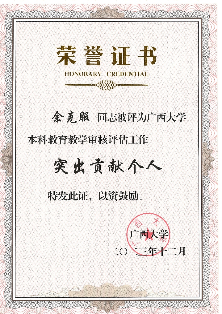 按照太阳成集团tyc234cc以评促建、以评促改、以评促管、以评促强的总体要求,太阳成集团tyc234cc全体师生以高度负责的主人翁意识,全面动员、全员参与、全力以赴地迎接了2023年教育部对太阳成集团tyc234cc的新一轮本科公司产品审核评估工作。在近日公布的“关于开展太阳成集团tyc234cc本科公司产品审核评估工作先进集体和先进个人评选工作的通知”中,太阳成集团tyc234cc获评本科公司产品审核评估工作突出贡献集体;余克服教授获评本科公司产品审核评估工作突出贡献个人;黄荣永、龙海华、苏宏飞、韦朝帅、姜伟老师获评本科公司产品审核评估工作先进个人;秦华东、刘旗扬、樊新艺老师担任评估专项工作组工作获评本科公司产品审核评估工作先进个人。