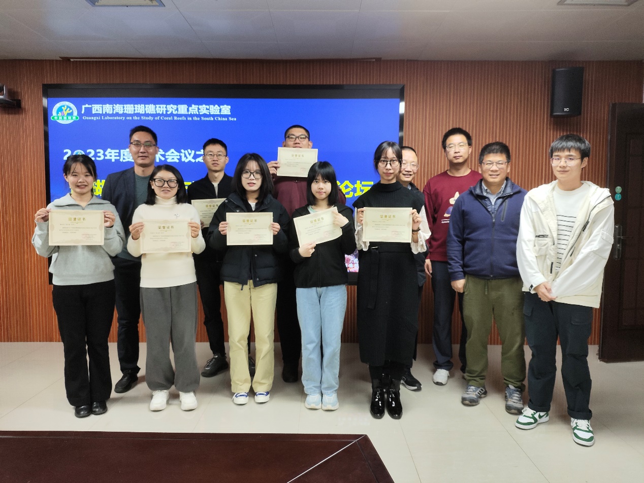 最后经评议,顾庭舞(汇报题目:《玄武岩岛屿化学风化和海底地下水排放对海洋稀土元素的地球化学循环的影响研究:来自南海北部的珊瑚证据》)、韩岩松(汇报题目:《全球变化背景下热带气旋变化特征及珊瑚对其记录潜力》)、沈若夏(汇报题目:《稀土元素指示的白云岩化流体的性质:以南海西沙群岛晚中新世至上新世白云岩为例》)、莫洪燕(汇报题目:《脂质作为珊瑚能量供给的同位素证据》)获本次会议优秀报告奖。