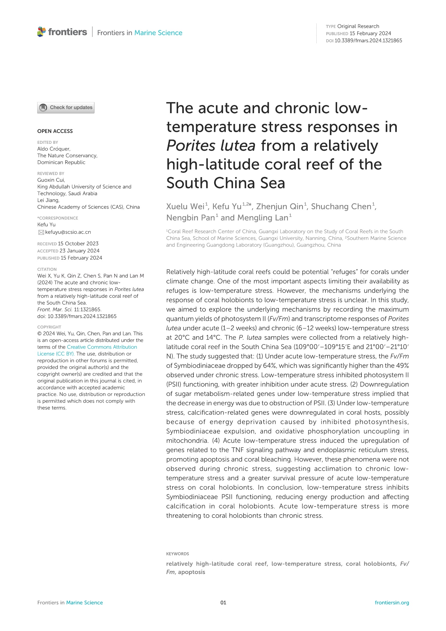 Wei X, Yu K, Qin Z, Chen S, Pan N and Lan M. (2024) The acute and chronic lowtemperature stress responses in Porites lutea from a relatively high-latitude coral reef of the South China Sea. Front. Mar. Sci. 11:1321865.doi: 10.3389/fmars.2024.1321865