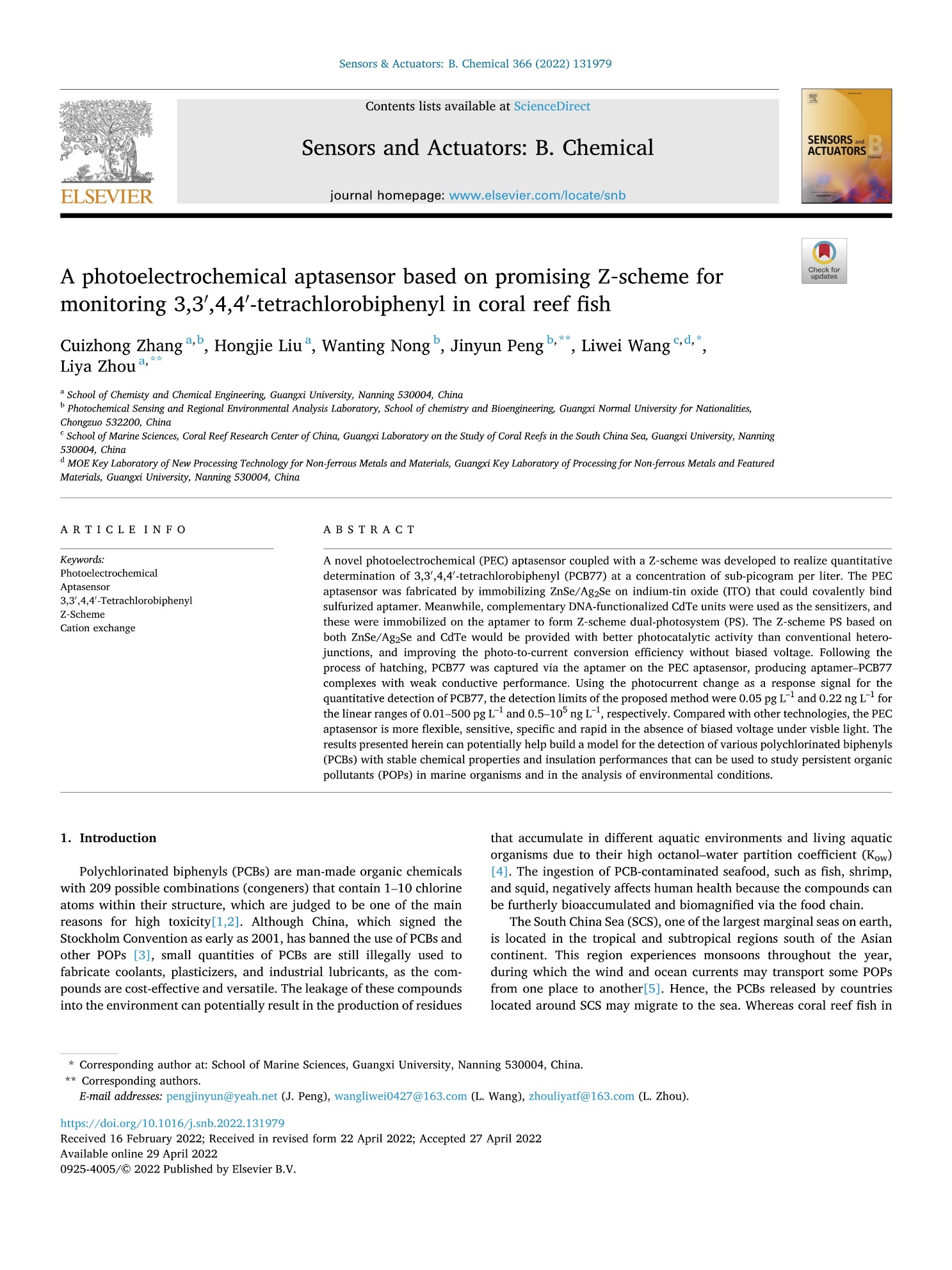 开发了一种耦合Z型异质结的新型光电化学适配体传感器,用于定量监测珊瑚礁区鱼类体内的超痕量3,3`,4,4`—四氯联苯(PCB77)有机污染物。该工作发表在太阳成集团tyc234cc1区TOP刊物 Sensors and Actuators B: Chemical, 2022, 366, 131979。(IF = 8.4)。