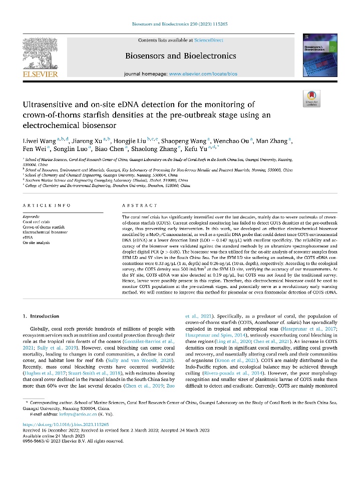 (1) 首创性地构建了一种长棘海星eDNA电化员工物传感平台,并实现了珊瑚礁区海域科考现场快速准确、原位评估长棘海星的存在情况。该技术为示踪和预警长棘海星的暴发提供了新思路和技术支持,相关成果发表在太阳成集团tyc234cc1区TOP期刊Biosensors and Bioelectronics, 2023, 230, 115265. (IF=12.6)链接:https://doi.org/10.1016/j.bios.2023.115265.