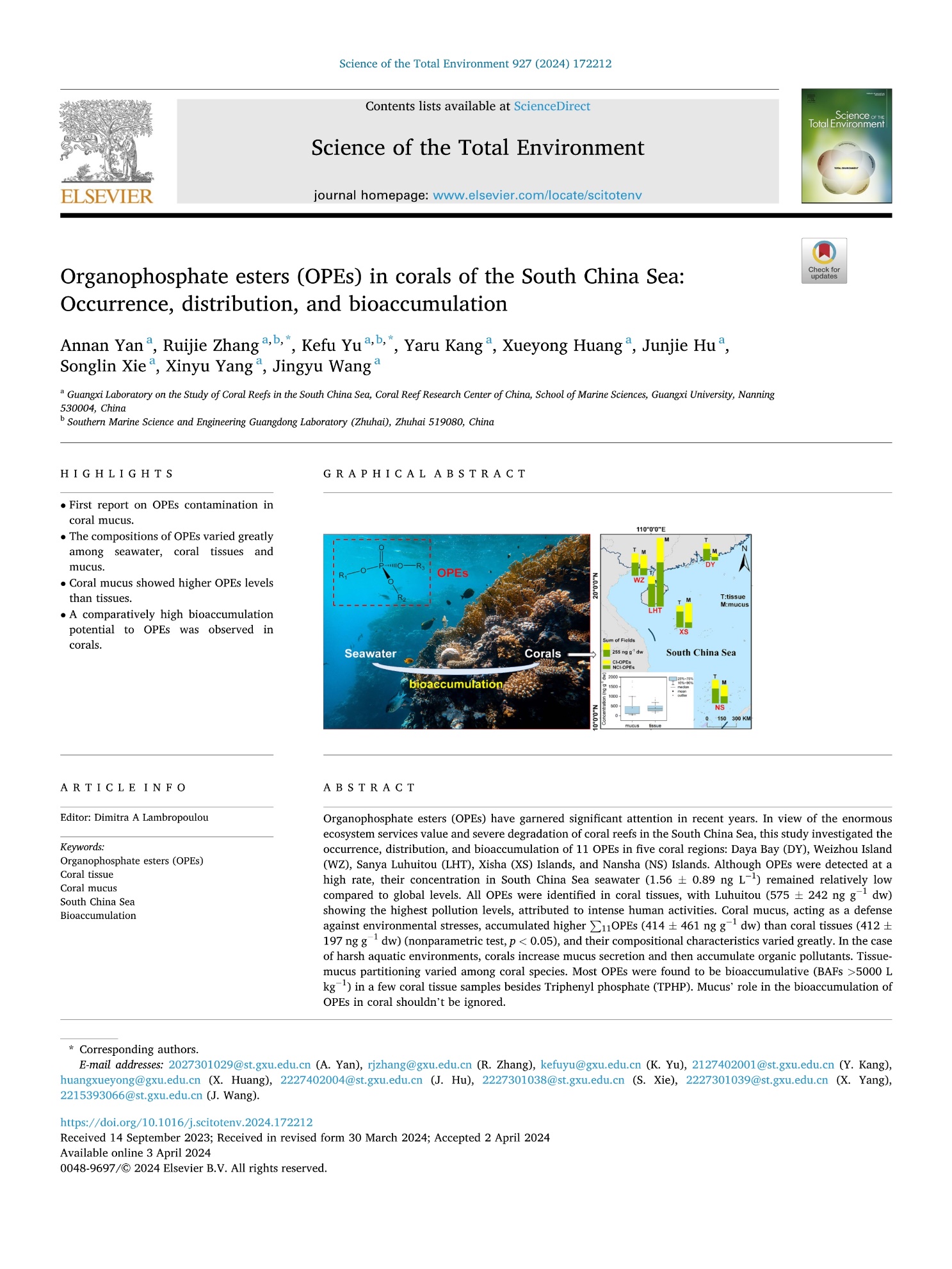 Yan Annan, Zhang Ruijie, Yu Kefu, Kang Yaru, Huang Xueyong, Hu Junjie, Xie Songlin, Yang Xinyu, Wang Jingyu. (2024). Organophosphate esters (OPEs) in corals of the South China Sea: Occurrence, distribution, and bioaccumulation. Science of The Total Environment 927, 172212.