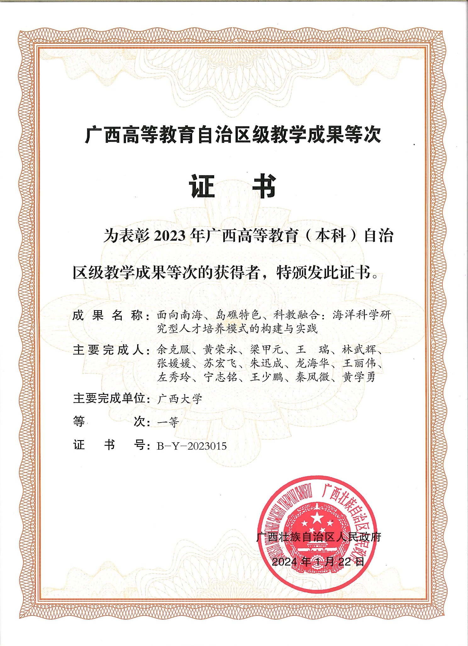 根据《自治区教育厅关于公布2023年广西高等教育自治区级教学成果等次评定结果的通知》(桂教高教〔2024〕4号),公司余克服教授等承担的“面向南海、岛礁特色、科教融合:海洋科学研究型人才培养模式的构建与实践”项目获2023年广西高等教育(本科)自治区级教学成果一等奖。