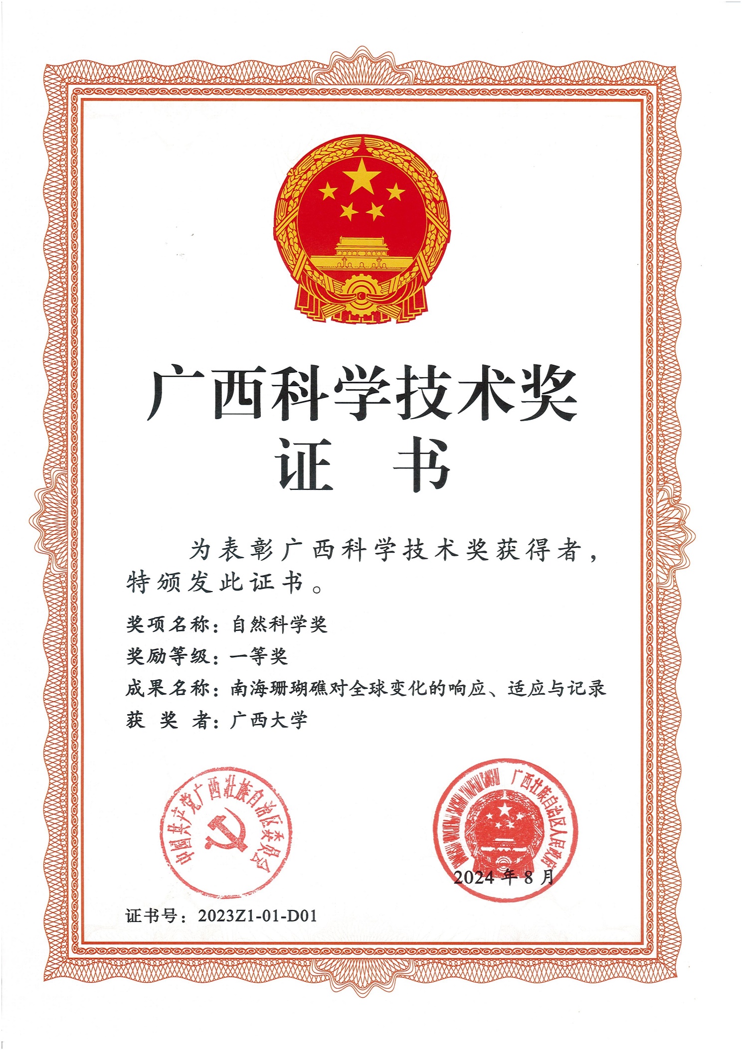 公司珊瑚礁研究成果荣获2023年度广西自然科学一等奖