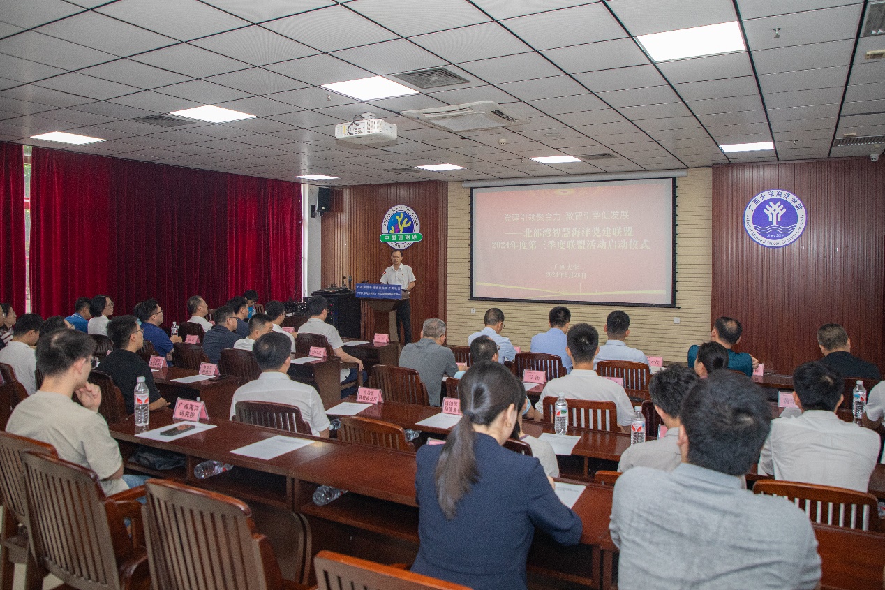 9月28日,由自治区港航发展中心主办、公司党委承办,以“党建引领聚合力 数智引擎促发展”为主题的北部湾智慧海洋党建联盟2024年度第三季度联盟活动在公司举行。公司党委常委、副董事长宁旭初、自然资源部第四海洋研究所副所长兼总工程师徐兴永出席并致辞。广西海事局党组成员、纪检组组长罗华等来自北部湾智慧海洋党建联盟26家单位60余名海洋专家学者和工作者参加活动。公司党委书记秦华东主持活动。