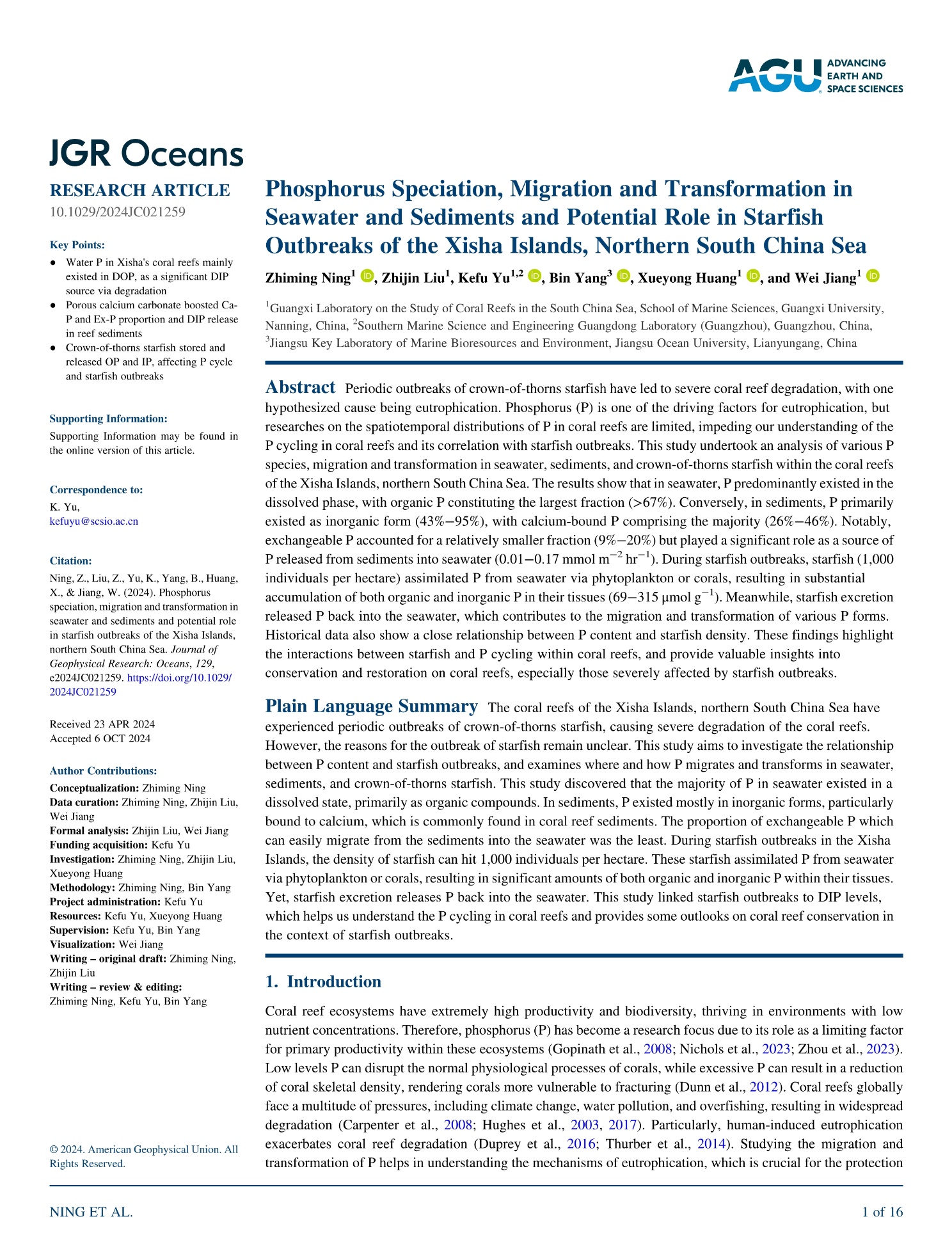 Ning, Z., Z. Liu, K. Yu, B. Yang, X. Huang, and W. Jiang (2024), Phosphorus speciation, migration and transformation in seawater and sediments and potential role in starfish outbreaks of the Xisha Islands, northern South China Sea, 129(10), e2024JC021259, doi: https://doi.org/10.1029/2024JC021259.