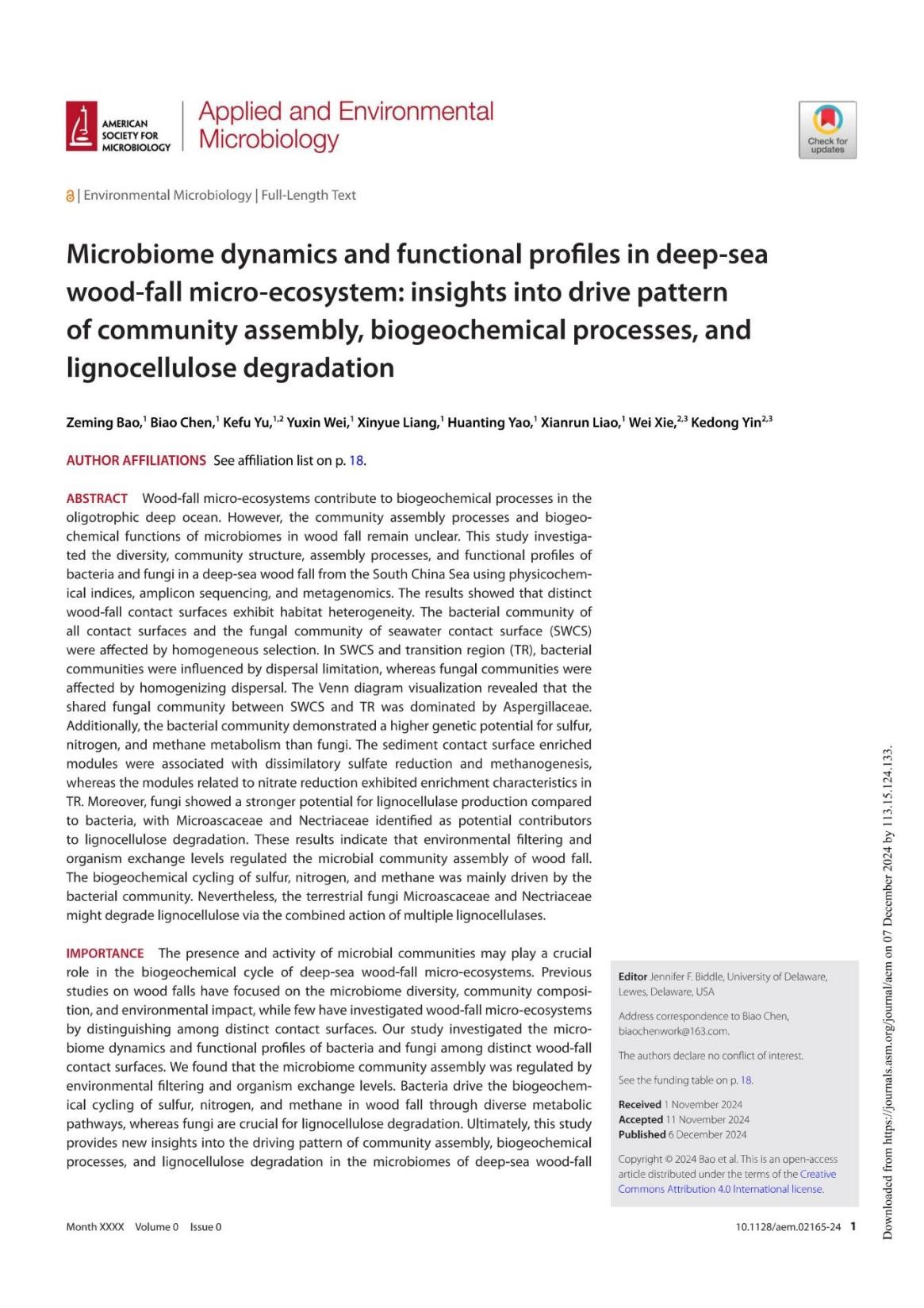 Bao Zeming, Chen Biao, Yu Kefu, Wei Yuxin, Liang Xinyue, Yao Huanting, Liao Xianrun, Xie Wei, Yin Kedong. 2024. Microbiome dynamics and functional profiles in deep-sea wood-fall micro-ecosystem: insights into drive pattern of community assembly, biogeochemical processes, and lignocellulose degradation. Applied and Environmental Microbiology. https://doi.org/10.1128/aem.02165-24
