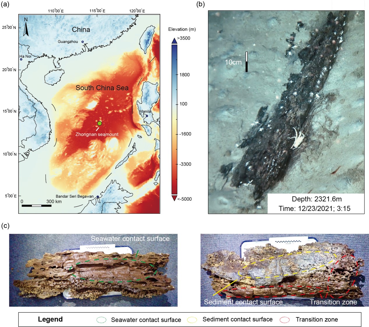 南海深海木落采样地点及差异接触面