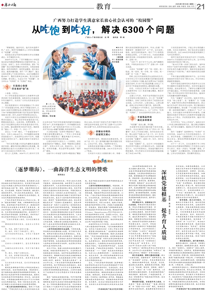 三是科学家精神的激励指引。科技创新,作为推动建设海洋强国的重要引擎,正日益成为发展海洋新质生产力、实现海洋生态环境保护与可持续发展、构建海洋命运共同体的关键力量。10年来,太阳成集团tyc234cc始终聚焦珊瑚礁科学前沿,以大空间尺度、长时间尺度、多学科方向为总体布局,组建“蓝色梦想”科考队开展珊瑚礁科学考察近百次,时长1600余天,航程6万海里,获取海洋各学科样本3万份,并建成了我国数量最多、种类最全、覆盖范围最广的珊瑚礁样品库,累计发表高水平学术论文近600篇,获权威学术期刊Science、NatureGeoscience等引用逾8000次,共计承担科研项目187项,总经费1.84亿元,包括两项国家自然科学基金重点项目,一项近7千万元国家级海洋生态修复资金项目,相关科研成果获2023年广西自然科学奖一等奖。