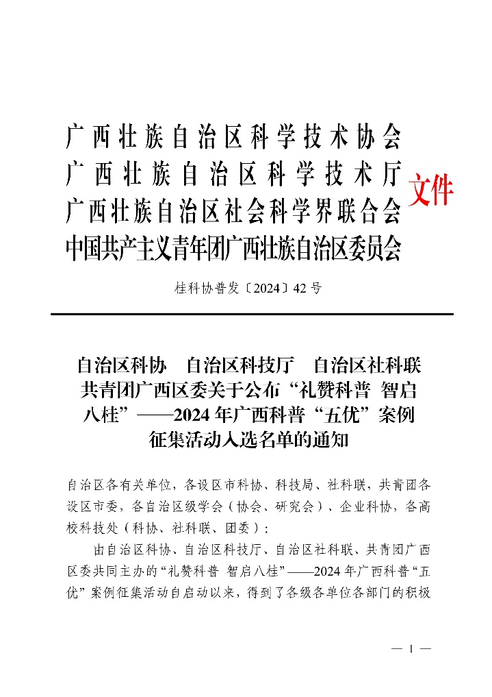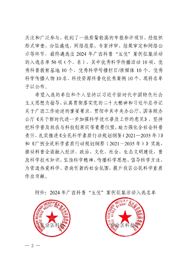 据悉,经组织形式审查、分层遴选、网络投票、专家评审、结果审定和网络公示等环节,2024年广西科普“五优”案例征集活动最终遴选出入选名单50项(个、名),其中优秀科学传播活动10项、优秀科普教育基地10个、优秀科学传播栏目/新媒体10个、优秀科学传播人物10名、科技资源科普化优秀案例10个。