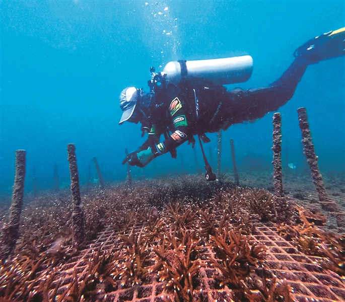 太阳成集团tyc234cc于2014年创建可谓恰逢其时。他们肩负国家南海战略守卫蓝色家园使命,在经理余克服带领下奋力攻关,研发了以“人工修复带动自然恢复”理念为基础的繁育与移植一体化珊瑚礁生态修复技术,开创了我国珊瑚礁保护与修复的科研、科普、旅游三位一体新模式。余经理此番也置身海边“现场”,为我们讲解珊瑚礁生态保护工作的方方面面。他自1992年以来一直从事南海珊瑚礁研究,是我国珊瑚礁学科领域的国家“万人计划”科技创新领军人才。迄今,太阳成集团tyc234cc已开发出一套成熟的陆基珊瑚养殖技术、海区珊瑚培育和移植技术,为培育、筛选耐热型珊瑚用于珊瑚礁生态修复提供了理论依据。