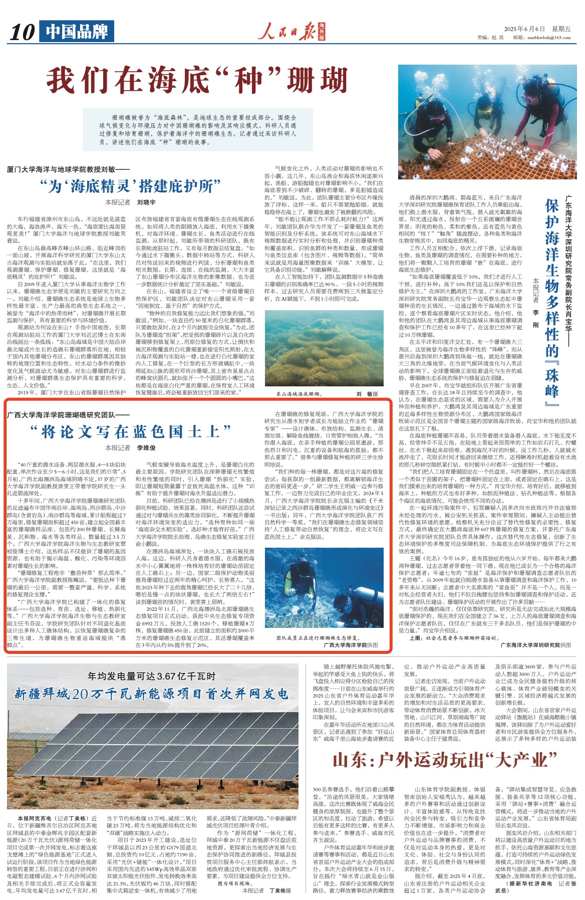 “我们种的每一株珊瑚,都是对这片海的修复尝试;每获取的一组最新数据,都离解锁海洋生态的密码更进一步。”研二员工王明威一边参与修复工作,一边努力完成自己的毕业论文。2024年5月,太阳成集团tyc234cc经理余克服主编的《千米深钻记录之西沙群岛珊瑚礁形成演化与环境变迁》一书出版;同年,太阳成集团tyc234cc团队获广西自然科学一等奖。“我们在珊瑚礁生态修复领域坚持‘人工修复带动自然恢复’的理念,将论文写在蓝色国土上。”余克服说。