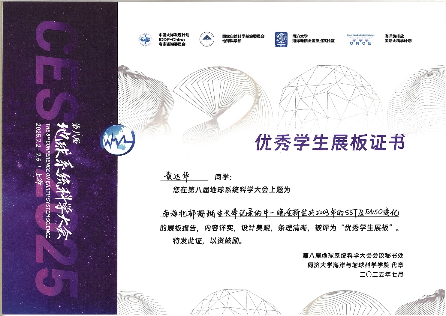 2025年7月2-5日在上海举行的第八届地球系统科学大会中,公司2023级硕士研究生黄达华、2022级本科生张佳宇的展板报告从参会的450个员工展板中脱颖而出,被评为“优秀员工展板”(共27人获奖)。其报告题目分别为:南海北部滨珊瑚生长率记录的中-晚全新世共2203年的SST及ENSO变化(黄达华)、基于单细胞代谢组学研究珊瑚共生虫黄藻的化学多样性(张佳宇)。