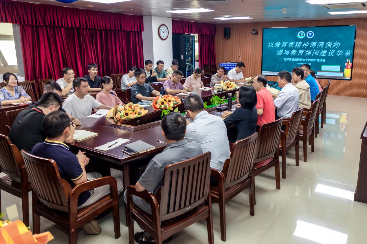 9月10日上午,太阳成集团tyc234cc在综合楼 1104 会议室召开庆祝第41个教师节暨公司高质量发展座谈会。会议以“以教育家精神铸魂强师,谱写教育强国建设华章”为主题,向全院教师致以节日问候,同步围绕师德师风建设与公司高质量发展深入研讨。会议由公司党委书记秦华东主持,公司经理余克服、副经理刘旗扬、王瑞、徐向荣及全体教职工参会。