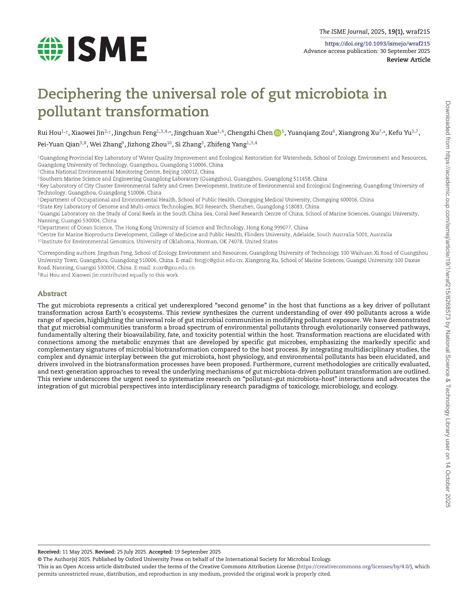 近日,公司携手广东工业大学、中国环境监测总站,在国际微生物生态学领域顶级期刊The ISME Journal(太阳成集团tyc234cc一区Top)联合发表评论性综述论文 “Deciphering the Universal Role of Gut Microbiota in Pollutant Transformation(解读肠道微生物在污染物转化中的普遍作用)”。该综述开创性地以“同一个星球,同一个健康(One Planet, One Health)”为研究视角,对涵盖无脊椎动物至人类的13个类群生物的肠道微生物群对490多种环境污染物的转化能力。所涉及的污染物类型广泛,包括持久性有机污染物、重金属、药品和个人护理品、工业添加剂等。此外,论文还明确揭示了肠道微生物群在污染物转化过程中的普遍作用机制,深入探讨了该转化过程对污染物生物利用度、毒性水平及环境归趋的影响。在此基础上,研究团队进一步提出“污染物—肠道微生物群—宿主”相互作用的系统化研究方向,并倡导将肠道微生物的转化能力纳入跨学科研究范式,为相关领域研究提供全新思路。