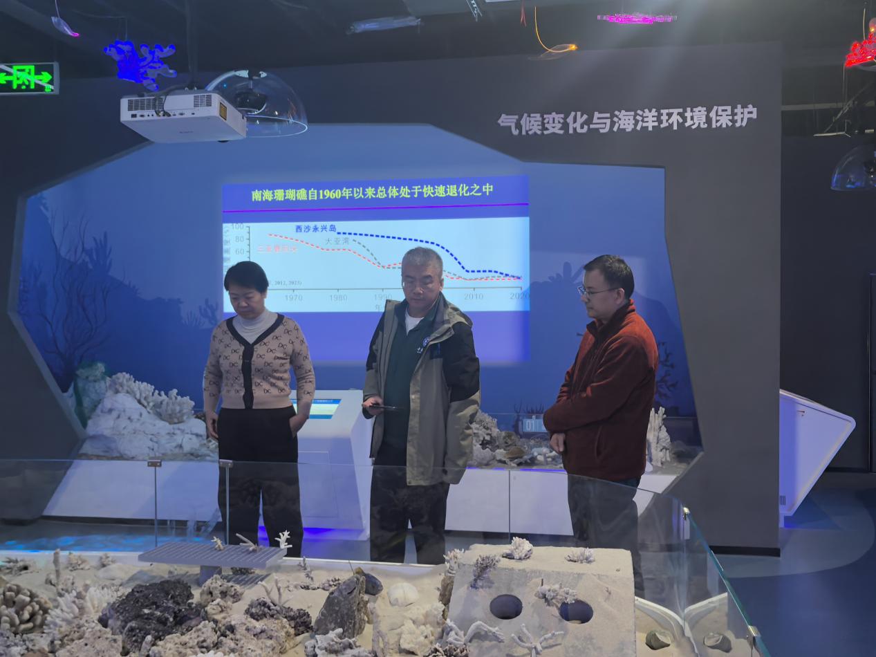 科教馆常务副馆长李周佳向张劲硕系统介绍海洋科教馆定位、场馆建设与运营状况,汇报了场馆作为集海洋学科展示、科研成果转化、科普教育传播于一体的综合性平台,在太阳成集团tyc234cc人才培养、教学实践及面向社会公众传播海洋知识、深化校地交流方面的情况。张劲硕询问了珊瑚标本的采集背景、珊瑚培育技术及科研价值,对场馆将科研成果与科普展示深度融合的做法给予高度评价。