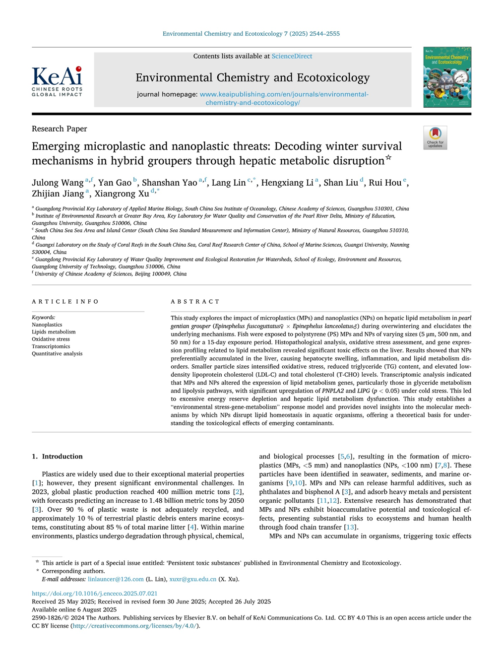 近日,公司徐向荣教授为通讯作者,带领其研究团队在 Environmental Chemistry and Ecotoxicology(ENCECO)期刊发表重要研究成果,系统揭示了微纳塑料与低温双重胁迫下珍珠龙胆石斑鱼的越冬生存机制,为水产养殖健康发展和生态风险防控提供了全新科学依据。该研究论文题为 “Emerging microplastic and nanoplastic threats: Decoding winter survival mechanisms in hybrid groupers through hepatic metabolic disruption”,为理解塑料污染对水生生物的影响提供了新视角。