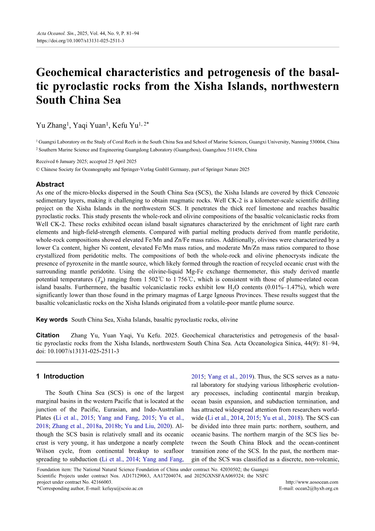 Zhang Yu, Yuan Yaqi, Yu Kefu. (2025). Geochemical characteristics and petrogenesis of the basaltic pyroclastic rocks from the Xisha Islands, Northwestern South China Sea. Acta Oceanologica Sinica, 44(9): 81–94. https://doi.org/10.1007/s13131-025-2511-3.
