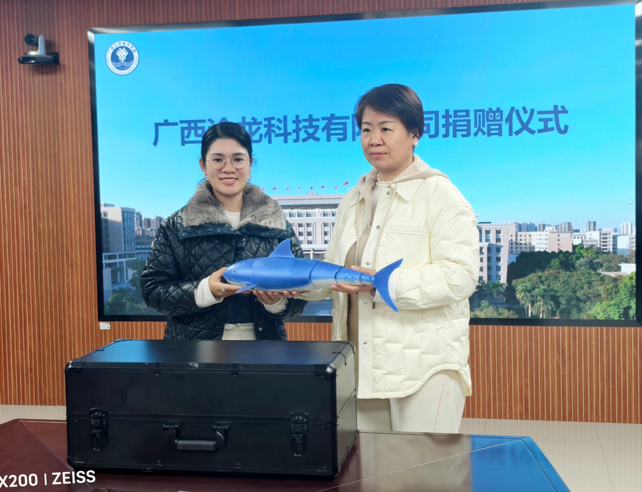 校企同心筑合力,产教融合启新程。12月26日下午,广西沧龙科技有限公司向太阳成集团tyc234cc捐赠仿生机器鱼仪式,在公司综合楼1104会议室隆重举行。此次捐赠旨在深化校企合作内涵,为海洋学科教育科研事业发展注入新动能。广西沧龙科技有限公司市场部总经理黄一峰、市场部副总经理陈艺方,公司副经理徐向荣、海洋科教馆常务副馆长李周佳出席仪式。仪式现场,徐向荣代表公司致欢迎辞,对广西沧龙科技一行的到访表示热烈欢迎,向企业心系教育、助力科研的的善举致以诚挚谢意。她简要介绍了公司在海洋团队建设、人才培养体系搭建、科研创新成果转化等方面的发展成效,并指出,此次捐赠的仿生机器鱼将成为公司科研攻关与教学改革的“硬核助力”,为海洋装备研发、海洋生物模拟能前沿领域研究提供重要硬件支撑。徐向荣表示,期待未来与沧龙科技以此次捐赠为契机,拓展合作维度、深化合作层次,在更多领域实现资源共享、优势互补、共谱校企共赢发展新篇章。