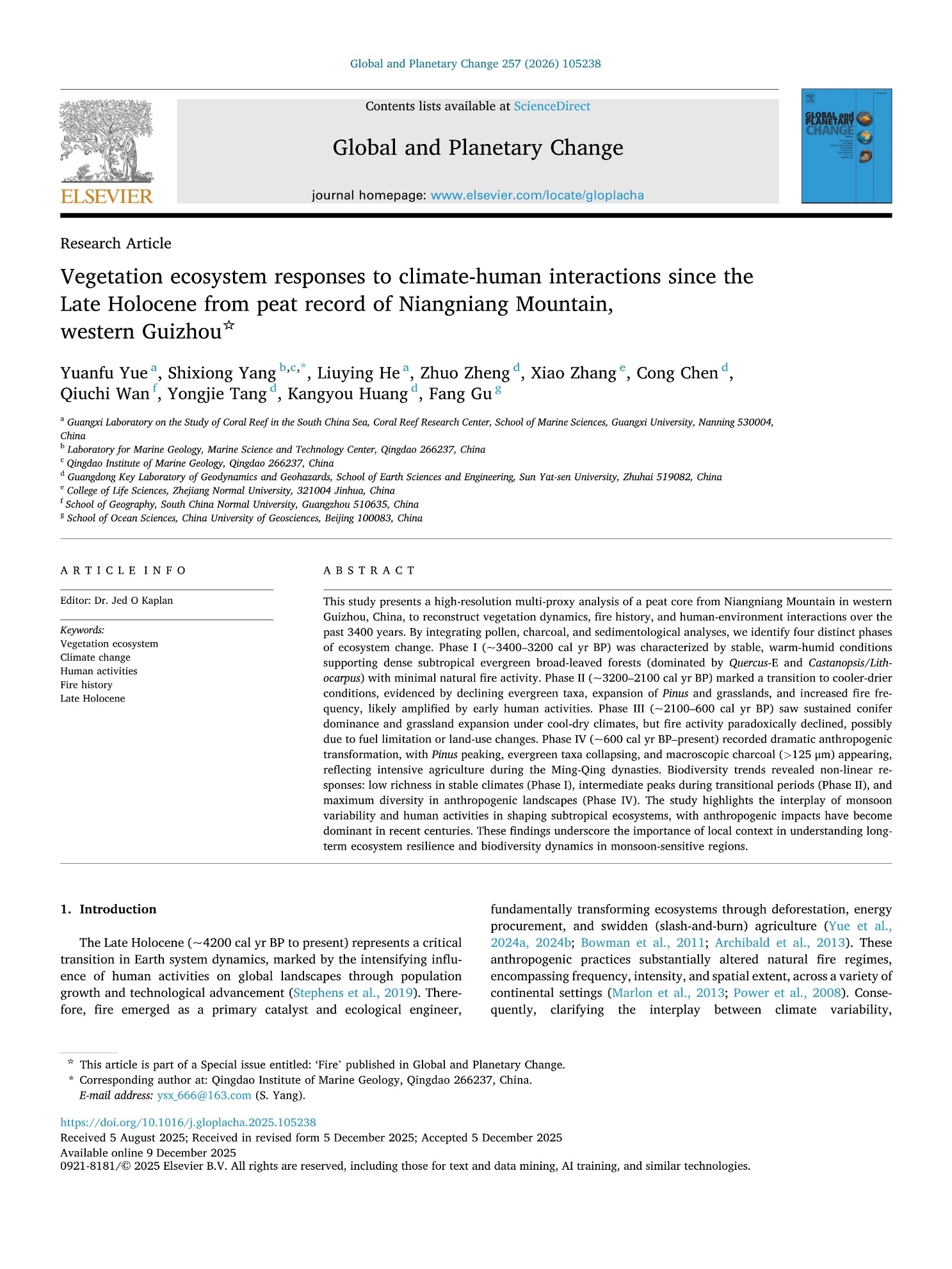 Yue Yuanfu, Yang Shixiong, He Liuying, Zheng Zhuo, Zhang Xiao, Chen Cong, Wan Qiuchi, Tang Yongjie, Huang Kangyou, Gu Fang, 2026. Vegetation ecosystem responses to climate-human interactions since the Late Holocene from peat record of Niangniang Mountain, western Guizhou. Global and Planetary Change 257, 105238, doi: https://doi.org/10.1016/j.gloplacha.2025.105238.