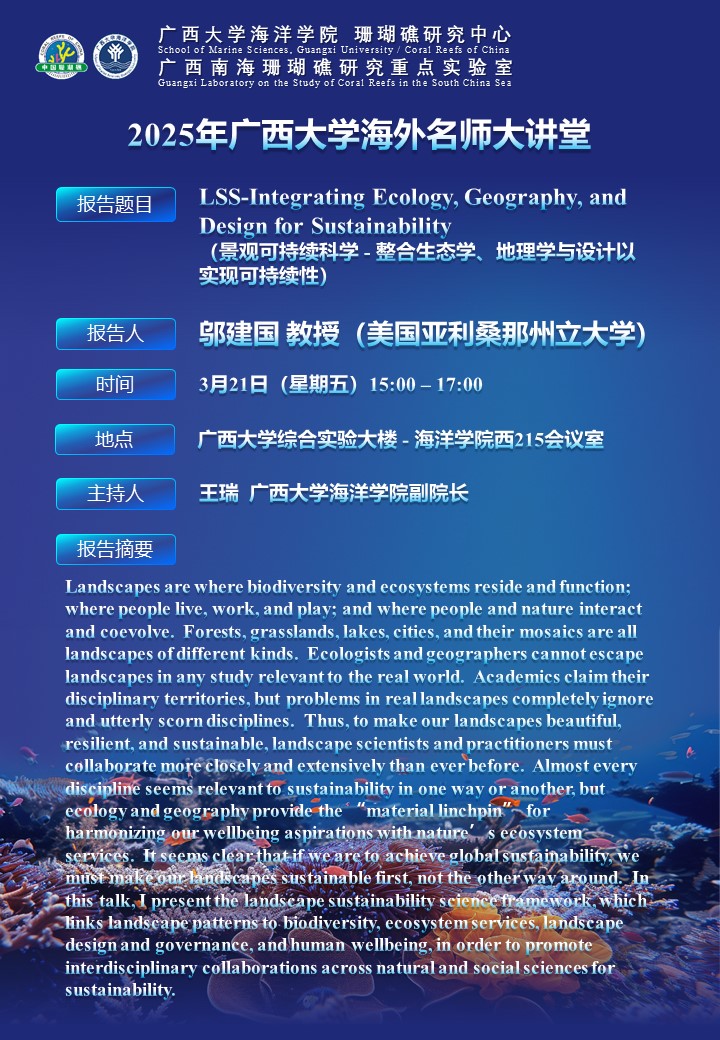 上一条:2025年6月16日 广东工业大学/南方海洋科学与工程广东省实验室(广州) 周文能教授 学术报告通知 下一条:广西南海珊瑚礁研究重点实验室2024年度学术会议——物理海洋与遥感研究生学术论坛